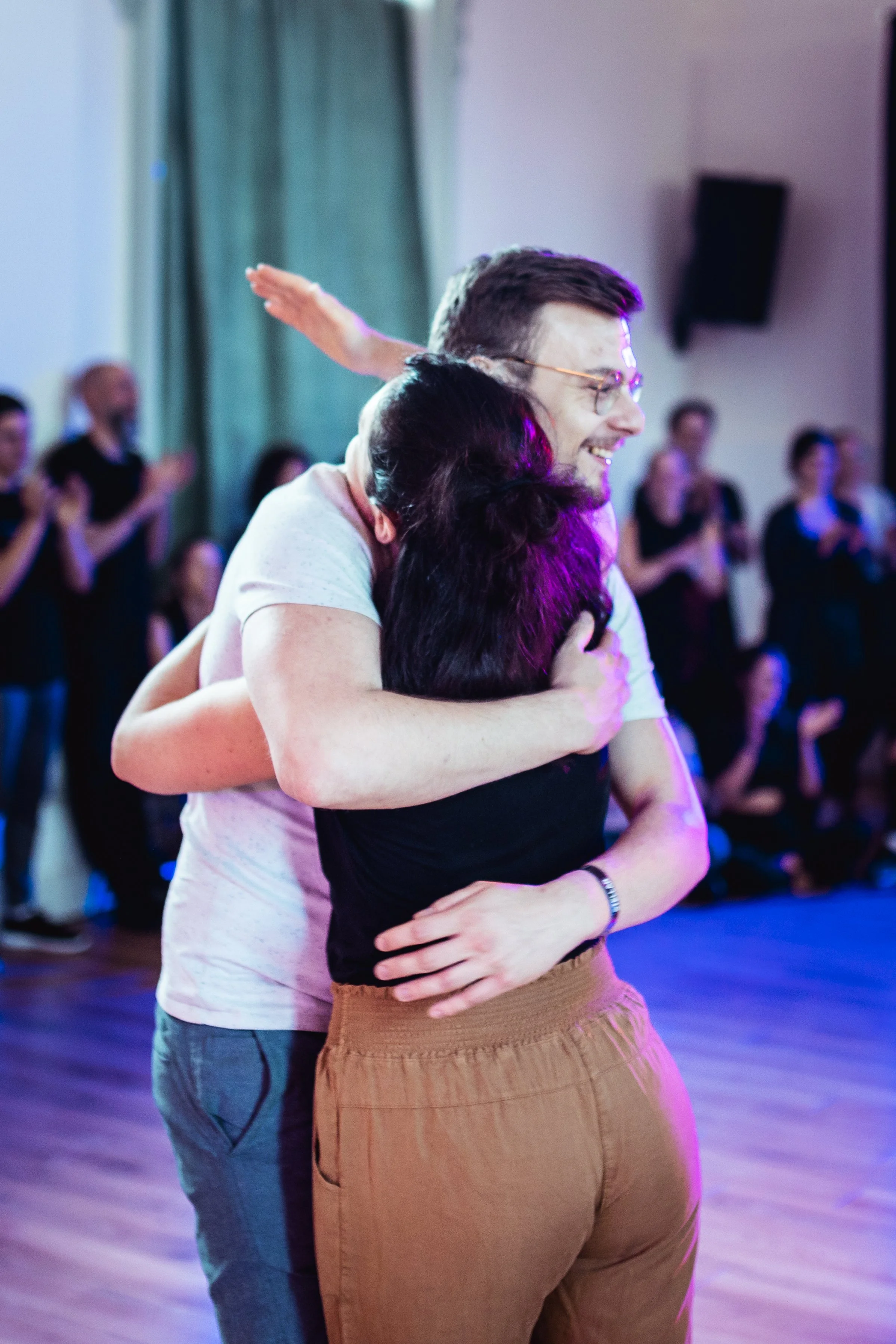 Deux personnes en train de danser et d'embrasser dans une salle, avec un groupe de personnes applaudissant en arrière-plan.